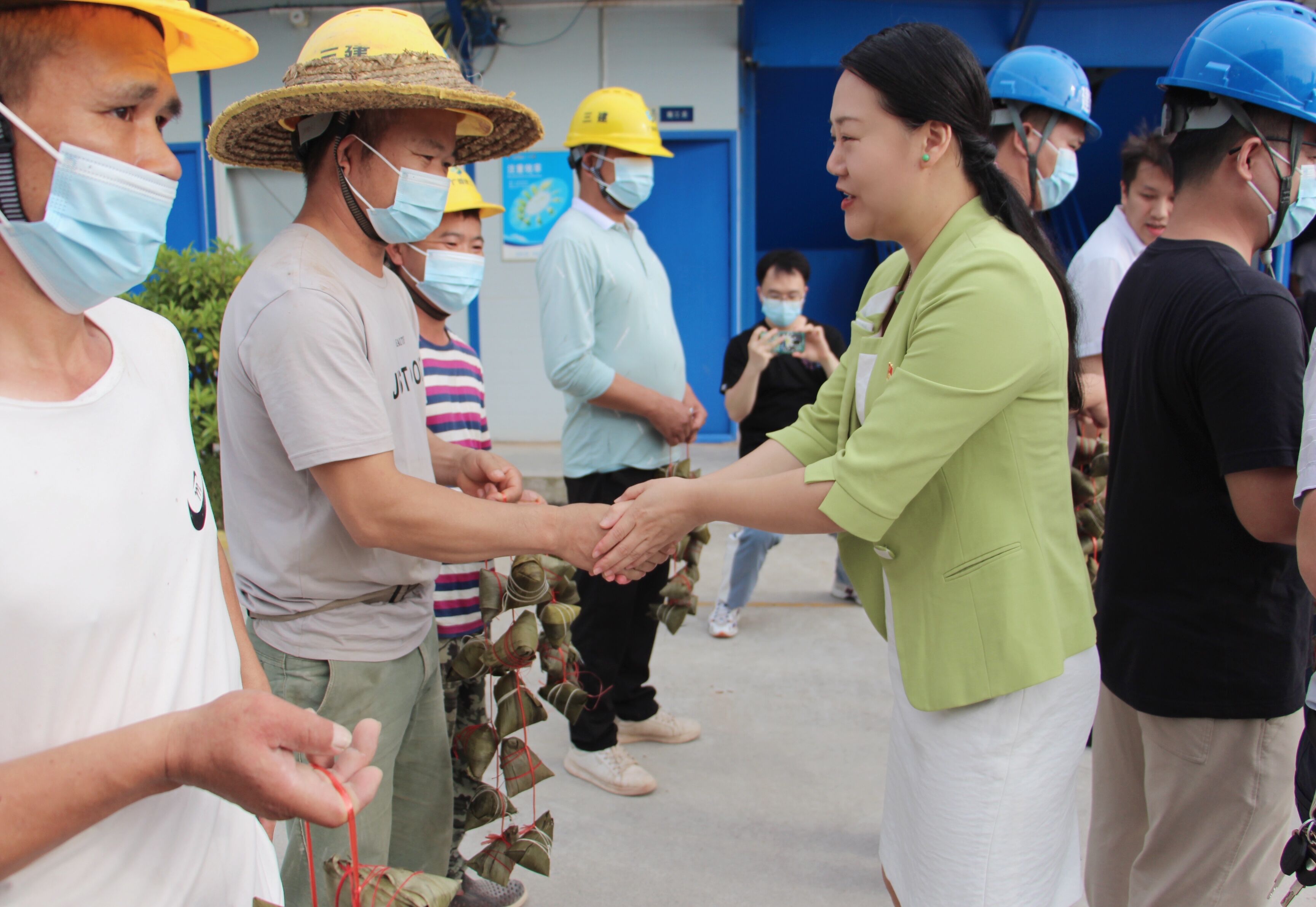 關(guān)心關(guān)懷進工地,濃濃粽情暖人心。座談會后,此次聯(lián)建的各黨支部相關(guān)領(lǐng)導共同慰問了項目一線工人,為他們送去粽子等慰問品和最真摯的節(jié)日問候,感謝一線工人的辛勤勞動、敬業(yè)付出以及為綠港?金陽產(chǎn)業(yè)城等南寧市重點項目建設做出的貢獻。慰問中,綠港集團黨委委員、副總經(jīng)理黃麗琴關(guān)切地詢問現(xiàn)場工人勞動安全保障情況和防疫情況,叮囑大家要注意勞動安全,防疫安全,堅持安全與生產(chǎn)兩手抓兩不誤,希望大家繼續(xù)保持昂揚的斗志,以高度的責任感和飽滿的工作熱情投身到項目建設中,為經(jīng)開區(qū)社會經(jīng)濟高質(zhì)量發(fā)展作出貢獻。