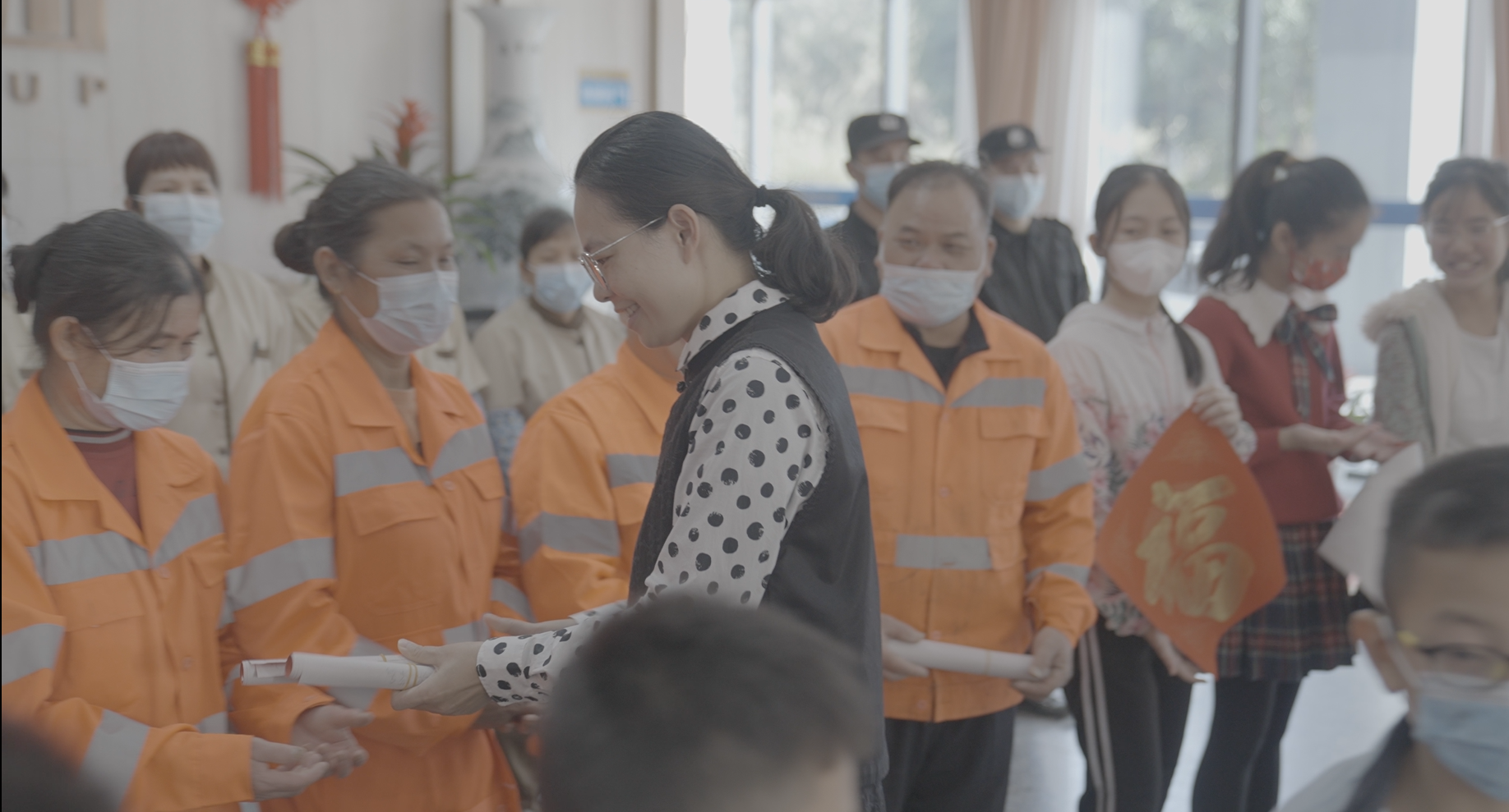 一平一仄譜喜悅,一撇一捺書祝福,活動最后,公司領(lǐng)導(dǎo)及志愿者們向30名來自一線的市政、綠化工人與物業(yè)服務(wù)人員贈送了春聯(lián),并向他們表達了濃濃的關(guān)懷和新春祝福。“春節(jié)貼春聯(lián)是我們的傳統(tǒng)習(xí)俗,過年的時候在家門口貼上親手寫的“?!弊志透幸饬x了,非常感謝集團公司在每年春節(jié)即將到來之際給我們送來這么好的禮物?!睒s鑫公司綠化工人唐素廂拿到春聯(lián)后高興地說。