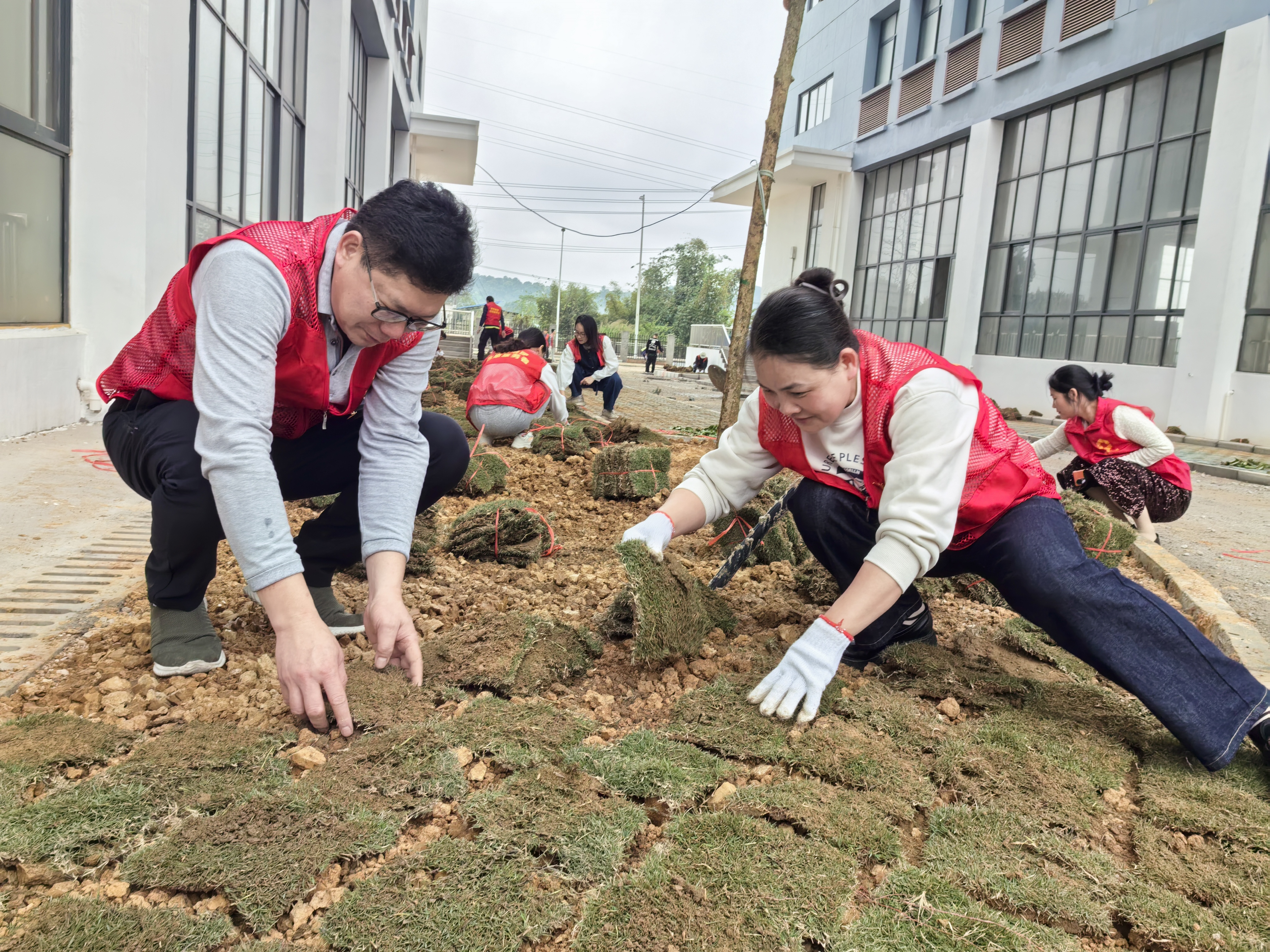 “這棵樹苗要扶正,不然長大后會歪的。”榮鑫公司黨支部委員、副總經(jīng)理唐欽月一邊指導(dǎo)身邊的同事,一邊用腳輕輕踩實樹苗周圍的泥土。笑著說:“植樹就像培養(yǎng)孩子,一開始就要打下好基礎(chǔ)?!?/span>的臉上掛著汗珠,但眼神中滿是認(rèn)真。不遠(yuǎn)處,年輕的入黨積極分子楊文君正和同事們一起鋪設(shè)草皮。他們動作熟練,配合默契,不一會兒就鋪出了一大片嫩綠的草地。楊文君擦了擦額頭的汗水,笑著說:“今天雖然累,但看到這片新綠,心里特別踏實。作為入黨積極分子,和黨員們一起為生態(tài)環(huán)境出一份力,感覺特別有意義。